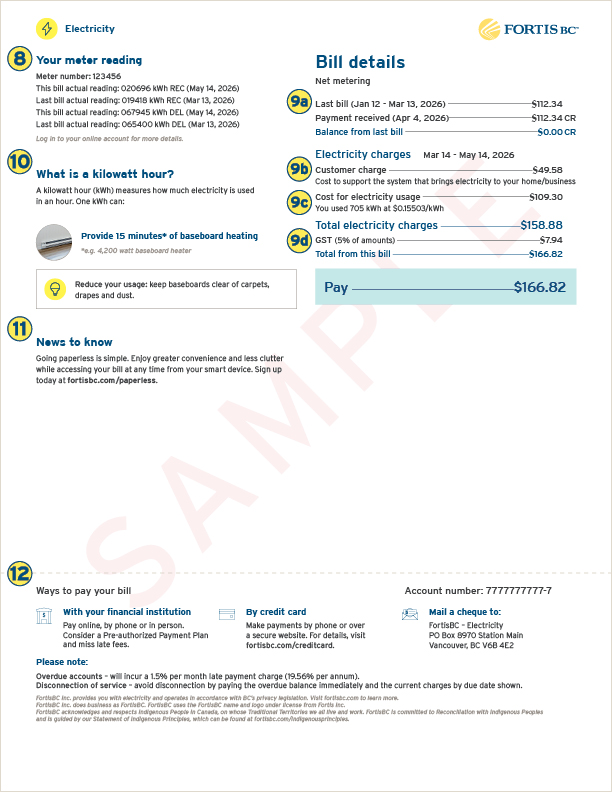 We want to make sure your net metering electricity bill is clear and makes sense to you. Since there’s more to your bill than the amount due, we’ve created a sample bill below that explains the different items that could appear on your residential bill.
